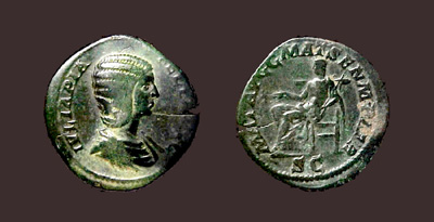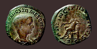 Her draped bust, r. Rev: IVNO REGINA; Juno stg. l, peacock at feet. 45. Julia Domna; wife of Septimius Severus; Æ Sestertius. (32mm; 19.33 gm; 1h). Rome mint, 211-217 AD. Obv: Her bust, r. Rev: MAT AVGG MAT SEN M PATR: "Mother of the two Augusti, Mother of the Senate, Mother of the Fatherland;" in ex: SC. Julia Domna seated l. holding branch and scepter. RIC 588. Wonderful glossy green patina. Rare...................................................................................(Image) $1425 46. Macrinus. 217-218 AD. AR denarius (3.33 gm). Obv: His laur., draped and cuir. bust, r. Superb, full-bearded portrait! Rev: AEQVITAS AVG. Aequitas stg. l., holding scales and cornucopia. Sear RC&V (Millenium edition) 7329. aEF.......(Image) SOLD 46a. Macrinus. 217-218 AD. AR Denarius (20mm; 3.14 gm; 12h). Rome mint, 5th officina. 3rd emission, 218 AD. Obv: Laureate and draped bust right. Rev: Macrinus seated left on curule chair, holding globe and short scepter. RIC IV 27; Szaivert series 11-12; RSC 51a.......................................................................(Video)(Image) $180 46b. Macrinus. 217-218 AD. AR Denarius