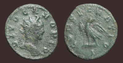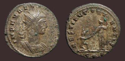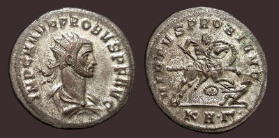 Antoninianus (23mm). Kyzikos/Cyzicus mint. 749. Probus. 276-282 AD. Antoninianus (22mm). Ticinum mint, Obv: Radiate and mantled bust left, holding eagle-tipped scepter. Rev: Concordia standing facing, head left, holding two signa. E in field to left, PXXI in exergue. C.123 - RIC.479. aEF, much silvering...............................................................................(Image) SOLD 750. Probus. 276-282 AD. Antoninianus (24mm). Serdica mint, 3rd officina. 4th emission, 277 AD. Obv: IMP C M AVR PROBVS P F AVG, radiate, helmeted, and cuirassed bust left, holding spear over shoulder and shield decorated with warrior on horseback and fallen horseman motif. Rev: VIRTVS PROBI AVG, Probus riding horse left, holding scepter and raising hand; to left, bound captive seated left; KAΓ in exergue. RIC V 887..................................(Image) SOLD 751. PROBUS. 276-282 AD. Antoninianus. 23mm. Kyzikos/Cyzicus mint. Obv: IMP C M AVR PROBVS P F AVG. Radiate, helmeted and cuirassed bust left, with shield and spear over shoulder. Rev: VIRTVS PROBI AVG, Probus riding horse left, raising hand and scepter; bound captive to left. Δ below horse, XXIMC in ex. RIC 913. Fully silvered....................................................................(Image) SOLD 752. Probus. 276-282 AD. Antoninianus. 23mm. Serdica mint. Obv: IMP CM AVR PROBVS PFAVG, radiate, cuirassed bust right. Rev: VIRTVS PROBI AVG, emperor galloping right, spearing enemy, shield beneath horse. Mintmark KA.Γ. in exergue. RIC 877. aEF. Much silvering..........................................(Image) SOLD 753. Probus. 276-282 AD. Antoninianus (24mm). Ticinum mint, 6th officina. 9th emission, 281 AD. Obv: Radiate bust left, wearing trabea and holding eagle-tipped scepter. Rev: Securitas standing left, with hand on head and leaning upon column to right; I in field to left; VIXXI in exergue. RIC V 525; Pink VI/1, p. 67..............................................................................................................(Image) $35 754. Probus. 276-282 AD. Antoninianus (21mm). Cyzicus mint, Obv: Radiate bust left, in imperial mantle, holding eagle-tipped scepter. Rev: Sol driving facing quadriga, raising hand and holding whip;S in ex. RIC V 911.(Image) SOLD 755. Probus. 276-282 AD. Antoninianus (3.65 g, 6h). Rome mint, 2nd officina. 3rd emission, 278 AD. Obv: Radiate bust left, wearing imperial mantle, and holding eagle-tipped scepter. Rev: Sol standing facing in spread quadriga, raising hand and holding globe and whip;S(crescent)R(crescent) in exergue. cf. RIC V 204/5. Mule? Underlying silvering.................................................................(Image) SOLD 756. Probus. 276-282 AD. Antoninianus (23mm). Rome mint, 5th officina. 2nd emission, 276 AD. Obv: Radiate bust left, wearing imperial mantle, holding eagle-tipped scepter. Rev: Sol driving facing quadriga, head left, holding whip and extending hand; crescent/R/crescent/Є in exergue. RIC V 204; Pink VI/1, p. 55. Some silvering.................................................................................(Image) SOLD 757. Probus. 276-282 AD. Antoninianus (23mm). Rome mint, 4th officina. 6th emission, 281 AD. Obv: Radiate and mantled bust left, holding eagle-tipped scepter. Rev: Roma seated facing, head left, holding Victory and scepter, within hexastyle temple; R(thunderbolt)Δ. RIC V 187; Pink VI/1, p. 58.......(Image) SOLD 758. Probus. 276-282 AD. .Antoninianus (22mm). Rome mint. Obv: IMP PROBVS AVG, radiate and cuirassed bust right with aegis on breastplate. Rev: ADVENTVS AVG, the Emperor, in military attire, on horseback left, holding scepter in left hand and raising right in greeting gesture; to left captive seated. R/thunderbolt/ Z in exergue. C__; RIC 158.............................................(Image) $45 759. Probus. 276-282 AD. Antoninianus (23mm). Rome mint, 4th officina. Obv: VIRTUS PROBI AUG, Radiate, helmeted, and cuirassed bust left, holding spear and shield decorated with emperor riding right in front of soldiers. Rev: ADVENTUS PROBI AUG, Emperor on horseback left, raising right hand and holding scepter, trampling captive; Δ in exergue. RIC V, 166. Interesting shield decoration................................................................................................(Image) $115 760. Probus. 276-282 AD. Antoninianus (22mm). Invictus series. Siscia mint, 3rd officina. Obv: IMP PROBVS INV AVG, radiate and cuirassed bust right. Rev: CONCORD MILIT, Probus standing right, clasping hand of Concordia standing left; Γ between them. XXI in exergue. RIC V, 657. Scarce.....................(Image) $45 761. Probus. 276-282 AD. Antoninianus (22mm). Rome mint. Obv: Radiate and mantled bust left, holding eagle-tipped scepter. Rev: Sol in quadriga, left. RIC V, 203..........................................................................................................(Image) $15 762. Probus. 276-282 AD. Antoninianus (23mm). Ticinium mint. Obv: VIRTVS PROBI AVG, radiate and cuirassed heroic bust left, holding spear and shield. Rev: VIRTVS AVG, Virtus advancing right, holding strophy over left shoulder. PXXT in exergue. Scratches in reverse field........................................(Image) SOLD 763. Probus. 276-282 AD. Antoninianus. 23mm. Serdica mint. Obv: IMP CM AVR PROBVS PAVG(sic), radiate, helmeted, and cuirassed bust left, holding spear and shield. Rev: VIRTVS PROBI AVG, emperor galloping right, spearing enemy, shield beneath horse. Mintmark KAΓ in exergue. RIC 880. aEF......(Image) SOLD 764. Another, except PFAVG. RIC V, 877. EF. Almost full silvering.(Image) SOLD 765. Uncertain 3rd century emperor. Cup-shaped antoninianus. 20mm. Virtus reverse........................................................................................................(Image) $15 766. Carus. 282-283 AD. Antoninianus. 24mm. Spes reverse...............(Image) $15 767. Divus Carus. Died AD 283. Antoninianus (22mm). Lugdunum (Lyon) mint, 1st officina. 10th emissio
