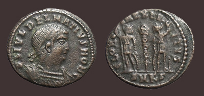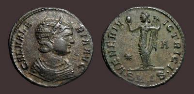 705. Numerian. 283-284 AD. Antoninianus (22mm, 3.45 g, 6h). Rome mint, 2nd officina. 4th emission, 283 AD. Obv: Radiate and cuirassed bust right. Rev: Jupiter standing left, holding Victory and scepter; eagle standing at feet; KAB. RIC V 410; Pink VI/2, p. 37, 5....................................................................(Image) $65 706. Saloninus, as Caesar. 255-259 AD. Antoninianus (20mm, 3.62 gm, 12h). Samosata mint. Obv: SALON VALERIANVS NOB CAES, radiate, draped, and cuirassed bust right. Rev: SPES PVBLICA, Spes standing left, holding hem of skirt, presenting flower to Saloninus standing right in uniform, holding spear;. RIC V 36. Slight silvering; surface roughness.......................................(Image) $20 707. Maximinus II.310-313 AD. Æ Follis (23mm, 5.34 g, 11h). Antioch mint, 5th officina. Struck 312 AD. Obv: IMP C GAL VAL MAXIMINVS P F AVG, laureate head right. Rev: SOLI IN VICTO, Sol standing facing, head left, holding bust of Serapis and raising right hand; Є/star//ANT. RIC VI 167b. aEF, glossy black patina, earthen deposits "Syrian patina.".............................................(Image) $85 708. Galeria Valeria, wife of Galerius. Circa 308-311 AD. Æ Follis (28mm, 5.50 gm, 6h). Thessalonica mint. Obv: GAL VALE-RIA AVG, diademed bust right, wearing embroidered robes. Rev: VENERI V-ICTRICI, Venus standing facing, head left, holding up apple in right hand and raising drapery over shoulder with left; ✵-B/•SM•TS•. RIC VI 36. Black patina; glossy fields......................(Image) $45 708a. Another.............................................................................................(Image) $55 709. Galeria Valeria, wife of Galerius. Æ Follis (26mm, 5.60 gm, 6h). Struck circa 310 AD. Heraclea mint. Obv: GAL VAL-ERIA AVG, diademed and draped bust right. Rev: VENERI V-ICTRICI, Venus standing facing, head l., holding apple in r. hand and raising drapery over shoulder with l. HTΔ. RIC VI 43..........(Image) $50 710. Galeria Valeria, wife of Galerius. Augusta, 308-311 AD. Æ Follis (26mm, 6.81 gm, 12h). Thessalonica mint. Struck 308-310 AD. Obv: Diademed and draped bust right. Rev: Venus standing left, holding apple and raising drapery; ✴- A in field; •SM•TS• in ex. RIC VI 36. Slightly glossy black patina.(Image) $125 710a. Galeria Valeria. Augusta, 308-311 AD. Æ Follis (27mm, 7.03 gm, 6h). Cyzicus mint, 4th officina. Struck circa 308-309 AD. Obv: GAL VAL-ERIA AVG, diademed and draped bust right. Rev: VENERI V-ICTRICI, Venus standing facing, head left, lifting dress and holding apple; Δ in left field; MKV in exergue. RIC VI 46....................................................................................................(Image) $40 710b. Galeria Valeria. Augusta, 308-311 AD. Æ Follis (26mm, 4.50gm, 12h). Thessalonica mint, 2nd officina. Struck 310-311 AD. Obv: Draped bust right, wearing stephane. Rev: Venus standing facing, head left, holding up apple and raising drapery over shoulder; ✴- Δ in field; •SM•TS• in exergue. RIC VI, 36...............................................................................................................(Image) $45 711. Helena. Augusta, 324-328/30 AD. Æ Follis (18mm, 2.68 gm, 12h). Heraclea mint, 5th officina. Struck 325-326 AD. Obv: Diademed and mantled bust right wearing necklace. Rev: Securitas standing left, lifting dress with left hand and holding palm in right hand; •SMHЄ. RIC VII 95; LRBC 892...................(Image) $55 712. Crispus. Caesar. 316-326 AD. Æ Follis (18mm, 2.08 gm, 12h). Antioch mint, 2nd officina. Struck under Constantine I, 325 AD. Obv: Laureate, draped and cuirassed bust left. Rev: CRISPVS/ CAESAR in two lines; star above; SMANTB/•. RIC VII 58; LRBC 1323. Rare................................................(Image) $65 713. Delmatius, Caesar. 335-337 AD. Æ Follis (17mm, 1.51 gm, 7h). Cyzicus mint. Struck 336-337 AD. Obv: FL IVL DELMATIVS NOB C, laureate, draped, and cuirassed bust right. Rev: GLOR-IA EXERC-ITVS, two soldiers, each holding reversed spear and resting on shield, standing either side of standard;SMKS. RIC VII 132.................................................................................................(Image) $60 714. Vetranio. 350 AD. Æ (23mm, 4.26 gm, 7h). Thessalonica mint. Obv: Laureate, draped, and cuirassed bust right. Rev: Vetranio standing facing, holding in each hand a signum adorned with Chi-rho; star above, A-B/•TSA•. RIC VIII 132. Dark tone. Obverse flan flaw or broken die..................(Image) SOLD 715. Valentinian I. 364-375 AD. Æ (30mm, 8.48 gm, 6h). Nicomedia mint, 2nd officina. Struck 364-367 AD. Obv: Pearl-diademed, draped, and cuirassed bust right. Rev: Valentinian standing facing, head right, holding crowning Victory on globe in left hand and labarum in right hand; SMNB. RIC IX 7a.2; LRBC 2321. Rare............................................................................................................(Image) $55 716. Another, similar, but Nicomedia mint. (26mm, 9.59 gm, 6h). Scratches on reverse; weak strike.................................................................................(Image) $35 717. Aelia Flaccilla. Augusta, 379-386/8 AD. Æ (22mm, 5.46 gm, 1h). Cyzicus mint, 3rd officina. Obv: Pearl-diademed and draped bust right. Rev: Flaccilla standing facing, arms raised to chest; SMKΓ; RIC IX 24. Rare............(Image) $45 718. Aelia Flaccilla. Augusta, 379-386/8 AD. Wife of Theodosius I. Æ (14mm, 1.14 gm, 5h). Nicomedia mint? Obv: Diademed and draped bust right. Rev: Victory seated right, inscribing Chi Rho on shield set on short column; SMNE?. RIC IX 36 "smaller module." Rare.......................................................................(Image) $40 719. Procopius. 365-366 AD. Æ (18mm, 3.12 gm, 12h). Heraclea mint? Obv: Pearl-diademed, draped, and cuirassed bust left. Rev: Procopius standing facing, head right, holding labarum and shield; Christogram in upper right field; Mintmark off