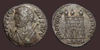 $95 782. Maximianus. First reign, 286-305 AD. Antoninianus (25mm, 3.65 g, 1h). Rome mint, 4th officina. Obv: Radiate, draped, and cuirassed bust right. Rev: Jupiter standing left, holding thunderbolt and scepter; XXIΓ in exergue. RIC V 506. Choice EF with almost full, lustrous silvering..............................(Image) $115 783. Maximianus. First reign, 286-305 AD. Æ Follis (28mm, 9.91 gm, 5h). Rome mint, 2nd officina. Struck circa 300-301 AD. Obv:Laureate head right. Rev: Moneta standing left, holding scales and cornucopia; S (club) in exergue. RIC VI 100b...........................................................................................................(Image) $45 784. Maximianus. First reign, 286-305 AD. Æ Quarter Follis (18mm, 2.03 gm, 6h). Siscia mint. Struck circa 305 AD. Obv: Laureate head right. Rev: Genius standing left, holding patera and cornucopia; SIS in ex. RIC VI 147....(Image) $15 785. Time of Maximinus II. 310-313 AD. Æ (15mm, 1.30 gm, 10h). ‘Persecution’ issue. Antioch mint, 3rd officina. Obv: (IOVI CON) SERVATORI, Jupiter seated left on throne, holding globe and scepter. Rev: (VIC)TOR IA AVGG, Victory advancing left, holding wreath in outstretched hand; Γ in right field. (ANT) in ex. Van Heesch, NC (1993), no. 2...................................................................(Image) $35 786. Time of Maximinus II. 310-313 AD. Æ (16mm, 1.26 gm, 11h). ‘Persecution’ issue. Antioch mint. Obv: GENIO ANTIOCHENI, Tyche seated facing on rocks; river-god Orontes swimming below. Rev: APOLLONI SANCTO, Apollo standing left, holding patera and lyre; E in field; SMA in ex. Van Heesch?........(Image) $25 787. Severus II. As Caesar. 305-306 AD. Æ Follis (27mm, 8.52 gm, 12h). Heraclea mint, 4th officina. Struck 305-306 AD. Obv: Laureate head right. Rev: Genius standing left, holding patera and cornucopia; HTΔ. RIC VI 25...........(Image) $95 788. Severus II. As Caesar. 305-306 AD. Æ Follis (28mm, 8.72 gm, 12h). Heraclea mint, 4th officina. Obv: Laureate head right. Rev: Genius standing left, holding patera and cornucopia; HTΔ in exergue. RIC VI 25..............................(Image) $115 789. Severus II. As Caesar. 305-306 AD. Æ Follis (28mm, 10.44 gm, 12h). Aquileia mint. 3rd officina. Obv: Laur. head right. Rev: Virtus standing facing, helmeted head left, holding victory in his right hand and spear and shield with his left; captive at his feet, to left. AQΓ in ex. RIC 72a. Very rare.....(Image) SOLD 790. Severus II. As Caesar, 305-306 AD. Æ Radiate Fraction (21mm, 3.12 gm, 12h). Alexandria mint, 3rd officina. Obv: Radiate, draped, and cuirassed bust right. Rev: Prince receiving Victory on globe from Jupiter; Γ in field; ALE in exergue. RIC VI 60a. Rare.........................................................................(Image) $25 791. Constantine I. 307- 337 AD. Æ (billon) Follis (18mm, 2.93 gm, 11h). Treveri (Trier) mint, 1st officina. Struck 318-319 AD. Obv: Helmeted and cuirassed bust left, holding spear over shoulder. Rev Two Victories standing vis à vis, together holding shield inscribed VOT/PR in two lines on altar; PTR in exergue. RIC VII 208A............................................................................................................(Image) $15 792. Constantine I. 307/310-337 AD. Æ Follis (19mm). Sirmium mint. Struck 324-325 AD. Obv: Laureate head right. Rev: SARMATIA DEVICTA, Victory advancing right, holding trophy and palm, spurning captive seated to right; SIRM in exergue. RIC VII 48....................................................................................(Image) $40 793. Licinius I. 308-324 AD. Æ Follis (20mm). Heraclea mint, 4th officina. Struck 316-317 AD. Obv: IMP LICI-NIVS AVG, laureate and draped bust left, holding mappa in right hand, globe and scepter in left. Rev: PROVIDEN-TIAE AVGG, campgate. MHTΔ in exergue. RIC 17.......................................................(Image) $15 794. Licinius I. 308-324 AD. Æ Follis (20mm, 3.29 gm, 11h). Heraclea mint, 4th officina. Struck 316-317 AD. Obv: IMP LICI-NIVS AVG, laureate and draped bust left, holding mappa in right hand, globe and scepter in left / PROVIDEN-TIAE AVGG, campgate with seven brick layers, three turrets, and no doors; HTΔ in exergue. RIC VII 15. Superb EF; substantial silvering..........................(Image) $65 795. Licinius I. 308-324 AD. Æ Follis (25mm, 4.23 gm, 6h). Cyzicus mint, 3rd officina. Struck circa 311 AD. Obv: VAL LICINNIANVS LICINNIVS P F AVG, laureate head right. Rev: GENIO AV - GVSTI CMH. Rev: Genius standing left, holding patera, from which liquid flows, and cornucopia. MKVΓ in exergue. RIC 76; C. 25. Scarce........................................................................................(Image) $25 796. Licinius I. 308-324 AD. Æ Follis (23mm, 3.86 gm, 12h). Siscia mint, 1st officina. Struck 315-316 AD. Obv: IMP LIC LICINIVS P F AVG, laureate head right. Rev: IOVI CON-SERVATORI, Jupiter standing left, holding globe surmounted by Victory, leaning on scepter; eagle with wreath standing to left; A in field; SIS in ex. RIC VII, 8. EF, excellent glossy black patina...........(Image) $55 797. Licinius I. 308-324 AD. Æ (19mm, 3.35 gm, 6h). Nicomedia mint, 2nd officina. Struck 317-320 AD. Obv: IMP LICI-NIVS AVG, laureate and draped bust left, holding mappa; scepter behind shoulder. Rev: IOVI CONS-ERVATORI AVGG, Jupiter standing left, holding globe surmounted by Victory, leaning on sceptre; palm-branch at left; S in field; SMN in exergue. RIC VII 24. EF, much silvering,....................................................................................................(Image) $65 798. Another, except Є in field. Also EF, with much silvering..............(Image) $55 799. Another, as 797 above. Also EF, with much silvering...................(Image) $55 800. Licinius I. 308-324 AD. Æ Follis (20mm, 3.40 gm, 11h). Heraclea mint, 2nd officina. Struck 321-324 AD. Obv: Radiate, draped, and cuirassed bust right. Rev: Jup