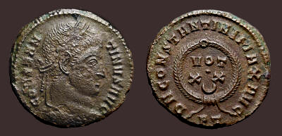 Diademed, draped and cuirassed bust right. 860. Constantine I. 307-337 AD. Æ Follis (20mm). Ticinium mint. Obv: Laureate head, right. Rev: DNCONSTANTINIMAXAVG around VOT/•./XX in wreath; ST in exergue. RIC 140. aEF, excellent brown/black patina.........................(Image) $75 861. Constantine I. 307-337 AD.