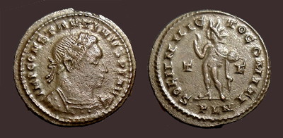 803. Licinius II, as Caesar. 317-324 AD. Æ Follis (19mm, 3.63 gm, 5h). Heraclea mint. Obv: Laureate and draped bust left, holding globe, scepter and mappa. Rev: Camp gate; MHTΔ in ex. RIC VII 19. EF, substantial silvering.....(Image) $40 804. Licinius II. as Caesar, 317-324 AD. Æ Follis (19mm, 2.93 g, 6h). Thessalonica mint. Struck 318-319 AD. Obv: LICINIVS IVN NOB CAES, laureate, draped, and cuirassed bust right. Rev: VOT V MVLT X CAESS ιn three lines within wreath; TSB in exergue. RIC VII 41. Rare. Some silvering.........(Image) $30 805. Licinius II. Caesar, 317-324 AD. Æ Follis (22mm, 2.84 gm, 2h). Siscia mint, 1st officina. Struck 320 AD. Obv: Laureate, draped, and cuirassed bust left, holding Victory on globe and mappa. Rev: Two captives seated at base of vexillum inscribed VOT/X in two lines; S–F on either side; ASIS✴ in exergue. RIC VII, II5 (r5). Rare..................................................................................(Image) $45 806. Licinius II, Caesar, 317-324 AD. Æ Follis (20mm, 3.19 g 1), Thessalonica, struck 320 AD. Obv: LICINIVS IVN NOB CAES, laureate head right. Rev: CAESARVM NOSTRORVM around VOT V; in ex. TSЄVI. RIC 92.....(Image) $25 807. Constantine I. 307-337 AD. Æ Follis? Seems silver. Siscia, Struck 318 AD. Obv: IMP CONSTANTINVS PF AVG, helmeted, cuirassed bust left with spear over shoulder. Rev: VICTORIAE LAETAE PRINC PERP, two Victories holding shield inscribed VOT PR on altar, ΓSIS in exergue. RIC 49..............(Image) SOLD 808. Constantine I 307-337 AD. Æ Nummus. Struck at Ticinium mint, 322-325 AD. Obv: CONSTANTINVS AVG, laur. and cuir. bust r. Rev: DN CONSTANTINI MAX AVG, VOT/•/XX/crescent within wreath; PT in ex. RIC VII, 167....(Image) $30 809. Gallienus. 253-268 AD. Antoninianus (20mm). Rome mint. Struck 267-268 AD. Obv: GALLIENVS AVG, radiate head right. Rev: APOLLINI CONS AVG, centaur walking right, drawing bow; Z (officina) in exergue. RIC V 163; Göbl 735b2..........................................................................................................(Image) $65 810. Gallienus. 253-268 AD. Antoninianus (19mm). Rome mint, 9th officina. 10th emission, 267-268 AD. Obv: Radiate head right. Rev: Hippocamp right; N in exergue. RIC V 245; MIR 36, 743b; RSC 667. EF.................................(Image) SOLD 811. Gallienus. 253-268 AD. Antoninianus (22mm). Rome mint. 1st emission, 253-254 AD. Obv: Radiate, bust right. Rev: Jupiter standing left, holding thunderbolt and scepter. N in left field. RIC V, 608; RSC 361................(Image) $20 812. Delmatius. Caesar, 335-337 AD. Æ Follis (17mm). Cyzicus mint, 5th officina. Struck 336-337 AD. Obv: Laureate, draped, and cuirassed bust right. Rev: Two soldiers standing to either side of signum, each holding spear and grounded shield; SMKЄ. RIC VII 131 var. (unlisted officina)................................(Image) SOLD 813. Julian II. 361-363 AD. Æ (18mm)). Struck 361-363 AD. Alexandria mint. Obv: D N FL CL IVLI-ANVS P F AVG, diademed, helmeted, and cuirassed bust left, holding spear and shield. Rev: VOT X MVLT XX in laurel wreath; ALEA in exergue. RIC VIII, 91.................................................................................(Image) $35 814. Julian II. 361-363 AD. Æ Follis (21mm). Nicomedia mint. Obv: D N FL CL IVLIANVS P F AVG, diademed, helmeted and cuirassed bust left, holding round shield and spear. Rev: VOT X MVLT XX, Legend in 4 lines within wreath. NIKΓ in ex. RIC VIII, 123 var. (officina). Scarce. EF, glossy black patina.........(Image) $95 815. Julian II. 360-363 AD. Æ (20mm). Sirmium mint, 2nd officina. Struck summer 361-summer 363 AD. Obv: Pearl-diademed, helmeted, and cuirassed bust left, holding round shield and spear. Rev: VOT/X/MVLT/XX in four lines; all within wreath; BSIRM in exergue. RIC VIII 108; LRBC 1619.................(Image) $40 816. Julian II. 360-363 AD. Æ (26mm). Thessalonica mint, 4th officina. Obv: Pearl-diademed, draped, and cuirassed bust right. Rev: Bull standing right, two stars above; (palm)TESΔ(palm) in ex. RIC VIII 225; LRBC 1696.........(Image) $25 817. Jovian. 363-364 AD. Æ