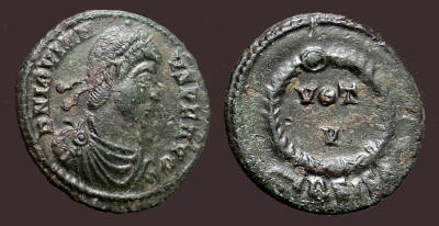 Laurel wreath enclosing VOT/V. in ex ASISC 818. Jovian. 363-364 AD. Æ (20mm). Constantinople mint, 3rd officina. Obv: Pearl-diademed, draped, and cuirassed bust right. Rev: VOT/ V in two lines within wreath; CONSPΓ in exergue. RIC VIII 178...................................(Image) $30 819. Jovian. 363-364 AD. Æ (20mm). Heraclea mint, 1st officina. Obv: Pearl-diademed, draped, and cuirassed bust left. Rev: VOT/V in two lines; all within laurel wreath; HERACA in exergue. RIC VIII 108...................................(Image) $45 820. Jovian. 363-364 AD. Æ (20mm). Heraclea mint, 2nd officina. Obv: Pearl-diademed, draped, and cuirassed bust left. Rev: VOT/V in two lines; all within laurel wreath; HERACB in exergue. RIC VIII 108....................................(Image) $30 821. Jovian. 363-364 AD. Æ (20mm). Sirmium mint, 2nd officina. Pearl-diademed, draped, and cuirassed bust right / VOT / V / MVLT / X in four lines within wreath; BSIRM. RIC VIII 118..........................................................(Image) $20 822. Jovian. 363-364 AD. Æ (23mm). Heraclea mint, 2nd officina. Obv: Diademed, draped and cuirassed bust left. Rev: VOT/ V/ MVLT/ X in four lines within wreath; HERACB in ex. RIC VIII 110; LRBC 1913. Larger flan...(Image) $55 823. Jovian? 363-364 AD. Æ (21mm at most). Extreme double struck coin, probably Jovian, RIC VIII 118. Mint mark not visible......................(Image) SOLD 824. Valens. 364-378 AD. Æ (18mm). Siscia mint, 2nd officina. Struck 367-375 AD. Pearl-diademed, draped, and cuirassed bust right / Soldier advancing right, dragging captive and holding labarum; ✴/H in field; QBSISC in exergue. RIC IX 14b var. Choice EF, glossy black patina...............................................(Image) $95 825. Valens. 364-378 AD. Æ (27mm, 7.62 gm, 12h). Nicomedia mint, 2nd officina. Struck 364-367 AD. Obv: Pearl-diademed, draped, and cuirassed bust right. Rev: Valens standing facing, head right, holding standard and Victory on globe; SMNB. RIC IX 7b, var. (unlisted officina); LRBC 2322. Rare "(r3)," but even rarer, since it is an unlisted officina......................................................(Image) $225 826. Valentinian I. 364-375 AD. Æ (28mm, 7.62 gm, 11h). Constantinople mint, 4th officina. Struck 364-367 AD. Obv: Pearl-diademed, draped, and cuirassed bust right. Rev: Valentinian standing facing, head right, holding crowning Victory on globe in left hand and labarum in right hand; CONSPΔ in exergue. RIC IX 15; LRBC 2065..............................................................................(Image) $225 827. Valentinian I. 364-375 AD. Æ (28mm, 8.27 gm, 6h). Aquileia mint, 1st officina. Struck 364-367 AD. Obv: Pearl-diademed, draped, and cuirassed bust right. Rev: Valentinian standing facing, head right, holding labarum and Victory on globe; SMAQP in exergue. RIC IX 6a; LRBC 961...............................(Image) $40 828. Valentinian I. 364-375 AD. Æ (17mm, 2.72 gm, 7h). Siscia mint. Struck circa autumn 384-summer 387 AD. Obv: D N VALENTINI-ANVS P F AVG, pearl-diademed, draped, and cuirassed bust right. Rev: GLORIA RO-MANORVM, emperor advancing half-right, head left, dragging bound captive and holding labarum inscribed with chi-rho symbol; D in right field.✴BSISC in exergue. RIC IX, 14a.-xi. Choice EF, with glossy dark green patina..........................(Image) $125 829. Valentinian II. 383-388 AD. Æ (22mm, 4.78 gm, 12h). Héraclea mint. Obv: D N VALENTINI-ANVS P F AVG, pearl-diademed, draped, and cuirassed bust right. Rev: VIRTVS E-XERCITI, emperor advancing rirgt, holding labarum and globe, left foot on bound captive. ✴in left field; SMHB in exergue. C. 57; RIC.24 a2 LRBC.1979. Rare. Smooth, glossy green patina....................................(Image) $65 830. Valentinian II. 383-388 AD. Æ (22mm, 4.17 gm, 7h). Siscia mint. Obv: D N VALENTINIANVS P F AVG, pearl-diademed, draped, and cuirassed bust right. Rev: Emperor standing left, receiving kneeling and turreted woman with right hand and holding on left hand Victory on globe, who crowns emperor with wreath. ASISC in exergue. RIC IX 26b.2; LRBC 1513.............................(Image) $20 831. Procopius. Usurper, 365-366 AD. Æ (20mm, 3.68 gm, 12h). Constantinople mint, 2nd officina. Obv: Pearl-diademed, draped, and cuirassed bust left. Rev: Procopius standing facing, head left, holding labarum and shield set on ground; Christogram to upper right; unidentified object by left foot; CONSB•. RIC IX 17a.4; LRBC 2082.....................................................................................(Image) $95 832. Another. Mintmark unclear...............................................................(Image) $15 833. Procopius. Usurper, 365-366 AD. Æ (20mm, 3.06 gm, 6h). Heraclea mint, 1st officina. Obv: Pearl-diademed, draped, and cuirassed bust left. Rev: Procopius standing right, holding labarum and shield set on ground; Christogram in upper right field; • in lower right field; SMHA in exergue. RIC IX 7.5. EF, superb portrait, glossy dark green patina; worn reverse die...........................(Image) $325 834. Another. Heraclea mint. 17mm........................................................(Image) $30 835. Aelia Flaccilla, wife of Theodosius I. Augusta, 379-386 AD. Æ (24mm, 3.89 gm, 12h). Constantinople mint. Struck 378-383 AD. Obv: Diademed draped bust right. Rev: Victory seated r., inscribing Chi-Rho on shield set on short column; CONA in ex. RIC IX 55; LRBC 2149. Glossy brown/black patina......(Image) SOLD 836. Another. Æ (22mm, 4.67 gm, 12h). Constantinople mint. T in r. reverse field. Officina unreadable. Earthen highlights, A splendid example..(Image) $95 837. Aelia Flaccilla. Augusta, 379-386/8 AD. Æ (21.5mm, 4.87 g, 12h).Constantinople mint, 5th officina. Struck 383-388 AD. Obv: AEL FLAC-CILLA AVG. Pearl-diademed and draped bust right. Rev: SALVS REI - PVBLICAE, Flacilla standing facing, arms raised to chest; Chi-Rho in right reverse fied. CONSЄ in exegue. C