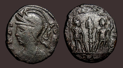 cuirassed bust right. 842. Eudoxia. Wife of Arcadius. Æ 18mm...............................................(Image) $15 843. Another. Æ 18mm..............................................................................(Image) $15 844. Honorius. 393-423 AD. Æ 15mm. Alexandria mint. Struck 406-408 AD. Obv: Pearl-diademed, draped, and cuirassed bust right; star behind. Rev: Arcadius, Honorius and Theodosius standing facing, each holding a spear; ALEA in exergue. RIC X, Arcadius 157, scarce......................................................(Image) $20 845. Constantine I. 307-337 AD. Æ Follis (18mm, 2.47gm, 12h). Constantinople mint, Struck 333-5 AD. Obv: Rosette-diademed, draped and cuirassed bust r. Rev: Two soldiers flanking two standards, both holding spear and shield; •CONSIA• in exergue. RIC VII 80, except mint mark not listed in RIC. Very rare. EF, glossy black patina............................................................................(Image) $85 846. Constantine I. 307-337 AD. Æ Follis (19mm, 2.81 gm, 12h). Constantinople mint, 7th officina. Struck 328 AD. Obv: Laurel and rosette-diademed, draped and cuirassed bust right. Rev: CONSTANTINI ANA DAFNE, Victory seated left on cippus, head right, holding palm frond in each hand; to left, bound captive seated left, head right, at base of trophy; Z in left field, CONS in exergue. RIC VII 35. Rare (r1). EF,Some silvering............................................................(Image) $125 847. Constantine I. 307-337 AD. Æ Follis (19mm). Thessalonica mint, 5th officina. Struck 320-321 AD. Obv: Laureate head right. Uplifted gaze? Rev: VOT/ XX in two lines within wreath; TSЄVI in exergue. RIC VII 117...............(Image) $35 848. Constantine I. 307-337 AD. Æ Follis (18mm, 3.49 gm, 12h). Londinium (London) mint. Struck 316-317 AD. Obv: CONSTANTINVS P AVG, laureate and cuirassed bust right. Rev: SOL INVIC TO COMITI, Sol standing left, extending right arm, holding globe in left; T-F in field, PLN in ex. RIC VII 88........(Image) $75 849. Another similar, but obverse legend ending PFAVG , and much larger flan. Æ 24mm, 4.52 gm, 6h. RIC VI 121a dating to 310...................................(Image) $95 850. Constantine I. 307-337 AD. Æ Follis (18mm). Cyzicus mint. Campgate. Some silvering. EF.....................................................................................(Image) $25 851. Constantine I. 307-337 AD. Æ Follis (18mm). Cyzicus mint. Jupiter. EF. Substantial silvering..................................................................................(Image) $30 852. Constantine I 307-337 AD. AE (billon?) (20mm, 3.09 gm, 6h). Rome mint, 4th officina, struck 318-319 AD. Obv: CONST - ANTINVS AVG, helmeted and cuirassed bust r. Rev: ROMAE A - ETERNAE, Roma seated r., holding shield inscribed X / V; in field, P - R; in ex. RQ. RIC VII, 146. Rare. Substantial "silvering" under dark toning.................................................................(Image) $95 853. Constantine I. 307-337 AD. Æ Follis (19mm, 3.22 g, 12h). Sirmium mint. Struck 324-325 AD. Obv: Laureate head right. Rev: SARMATIA DEVICTA, Victory advancing right, holding trophy and palm, spurning captive seated to right; SIRM in exergue. RIC VII 48. Scarce. Silvering under dark toning.......(Image) $40 854. Constantine I. 307-337 AD. Æ Follis (18mm). Lugdunum (Lyon) mint, 1st officin Struck 320 AD. Obv: Cuirassed bust right, wearing helmet with tall crest. Rev: Two Victories standing facing one another, supporting shield inscribed VOT/PR in two lines atop altar; (P)two captives(L). RIC VII –, but cf. 80 (draped and cuirassed bust). Scarce....................................................................(Image) $20 855. Constantine I. 307-337 AD. Æ Follis.(18mm). Thessalonica mint, 2nd officina 320-330 AD. Obv: Laureate bust right. Rev: Camp-gate with two-turrets and star above; mint mark SMTSB in ex; Much silvering. RIC 153....(Image) $40 856. Constantine I. 307-337 AD. Æ Follis. (18mm). Struck 318/319 AD. Ticinium mint. Obv: IMP CONSTANTINVS MAX AVG, cuirassed bust right in crested helmet with laurel wreath. Rev: VICTORIAE LAETAE PRINC PERP, Victories vis-à-vis, holding shield inscribed VOT/PR on altar with cross on it. PT in ex RIC: 82, C: 638..............................................................................................(Image) SOLD 857. Constantine I. 307-337 AD. Æ Follis (21mm). Treveri (Trier) mint. Struck 310-313 AD. Obv: CONSTANTINVS PF AVG, laureate, draped, and cuirassed bust right. Rev: SOLI INVIC-TO COMITI, Sol standing front, head left, chlamys over left shoulder, raising right hand, holding globe in left; T-F in field; PTR in exergue. RIC VI 874..................................................................................(Image) $25 858. Constantine I. 307-337 AD. Æ Follis (18mm). Thessalonica mint, 3rd officina. Struck 318-319 AD. Obv: Laureate, and cuirassed bust right. Rev: VOT XX/ MVLT/ •XXX•/ TS•Γ• in four lines within laurel wreath. Silvering under toning and deposits. RIC 31................................................................................(Image) $35 859. Constantine I.
